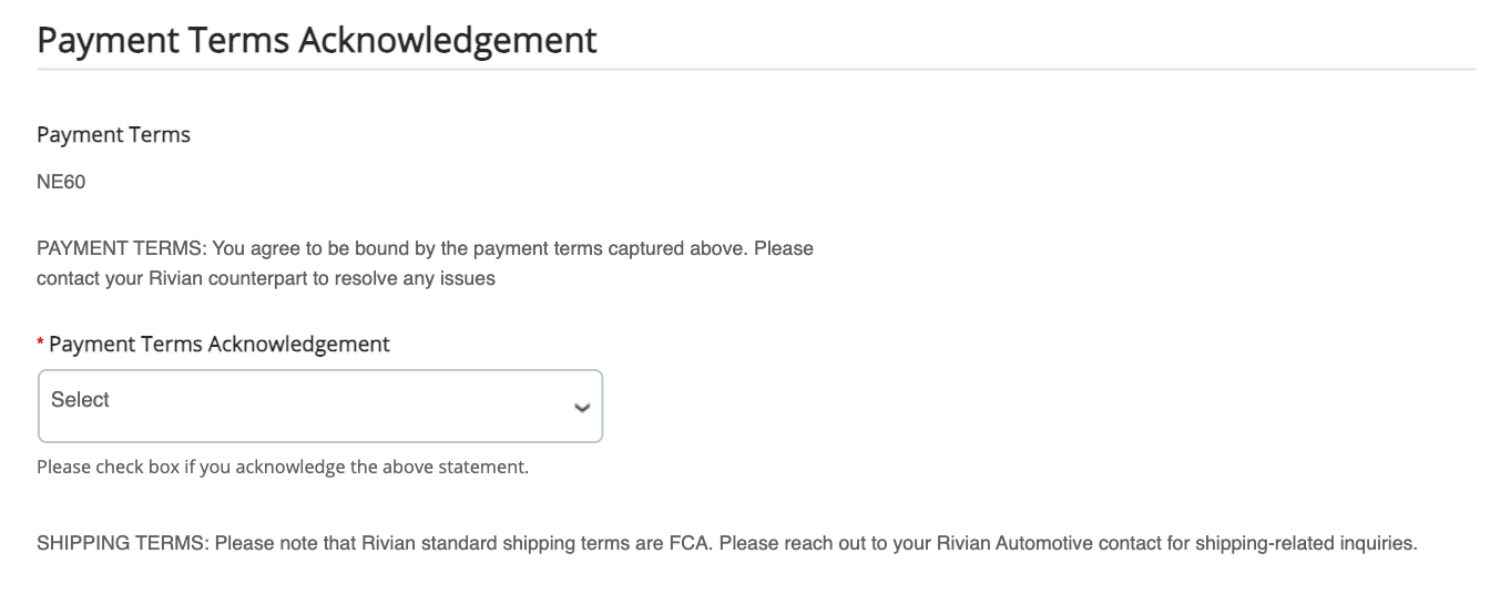 Please acknowledge the payment terms listed. Contact your Rivian counterpart to resolve any issues.