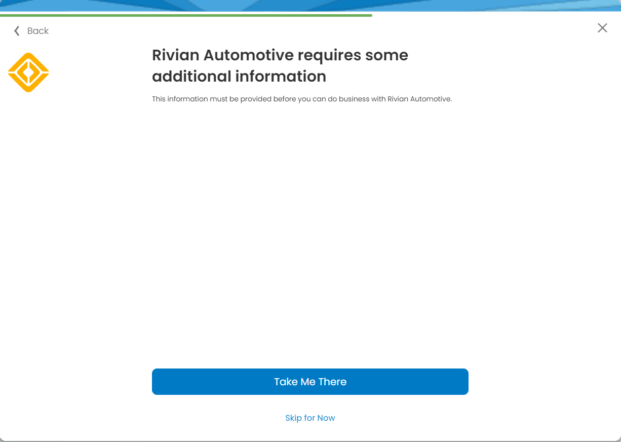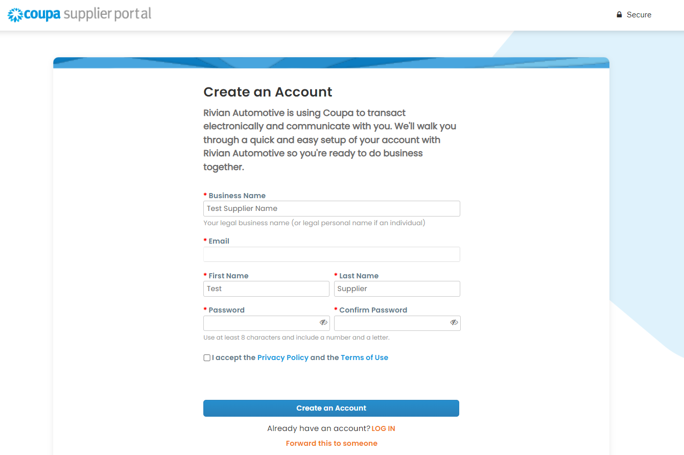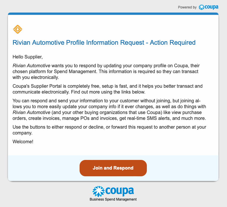Look out for an email from do_not_reply@supplier.coupahost.com and check your spam folder too. If you still can't locate the invitation, please reach out to vendormanagement@rivian.com. In the subject line, please include your vendor name.